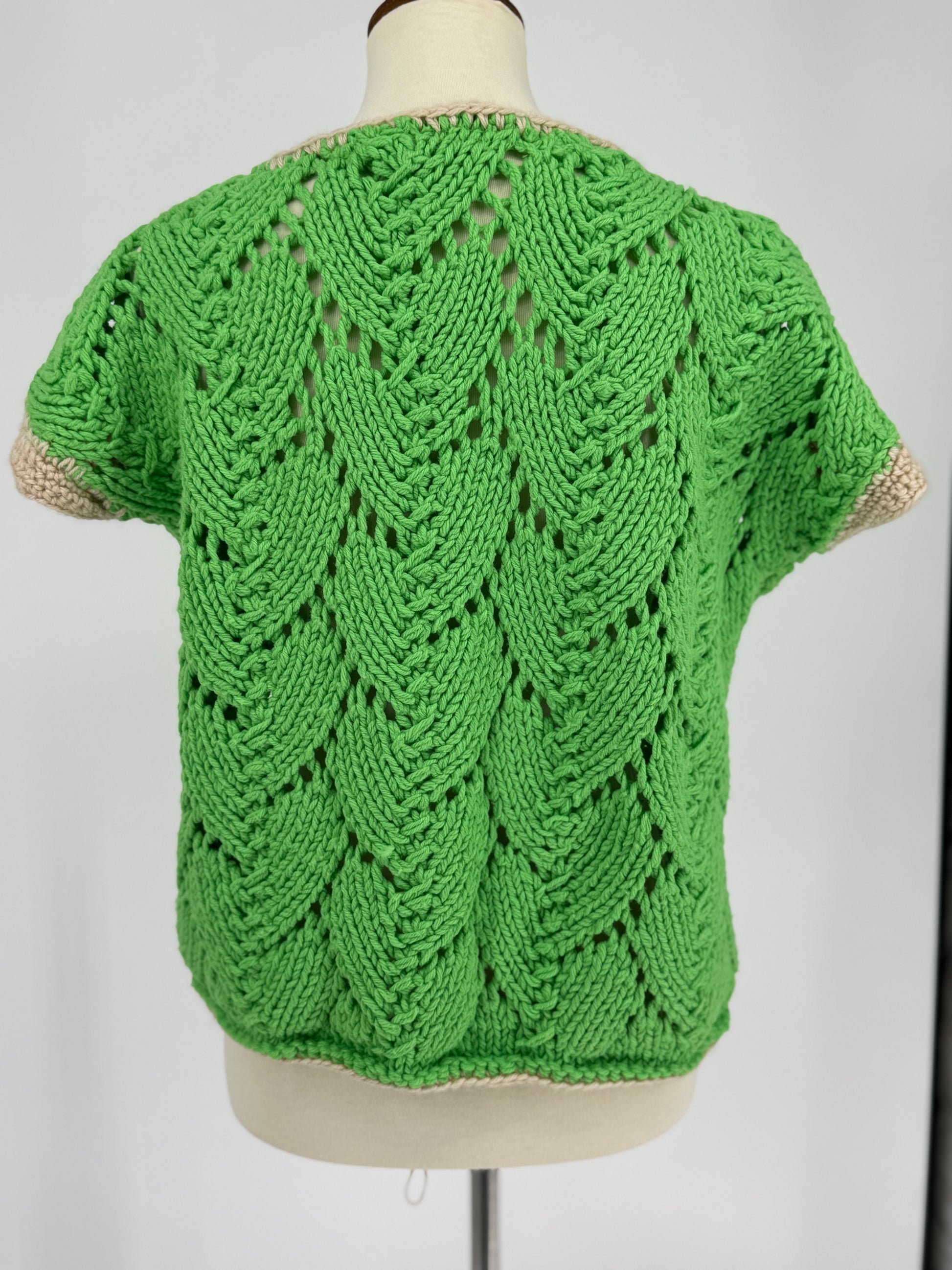The original knit still holds its bold, botanical rhythm, like rows of tiny ferns leaning toward the sun. Beige crochet trim now outlines the silhouette, a gentle reminder that reinvention can be both subtle and triumphant. Short sleeves that are not quite sleeves. A shape that isn’t trying too hard but somehow charms everyone anyway.