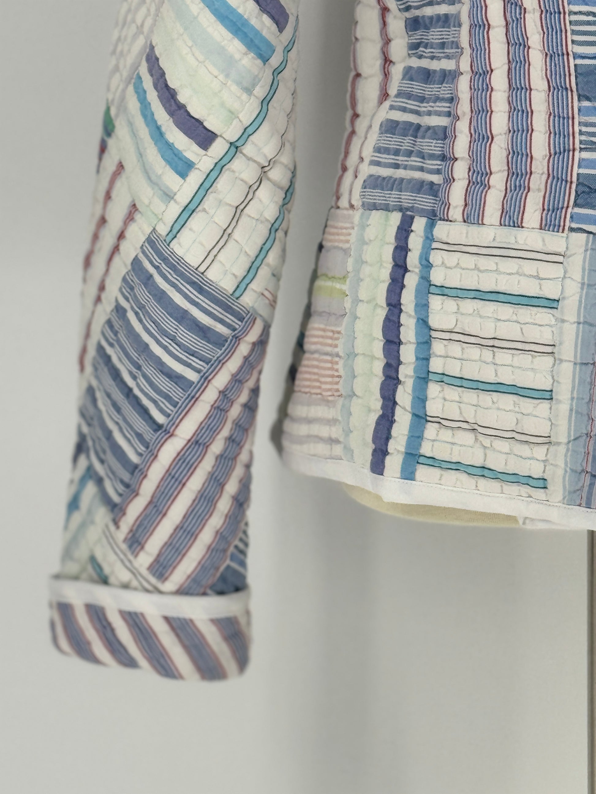 Legend has it this jacket began its life draped across the foot of a spare-room bed in a quiet farmhouse where summers stretched long and lemonade came in mason jars. A patchwork quilt stitched from decades of striped cotton scraps, it had seen everything. Afternoon naps. Storm-watching. One memorable incident involving a runaway kitten and a bowl of blueberries.